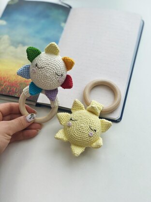 There are crochet amigurumi patterns of teether sun and rainbow flower teether (PDF file).