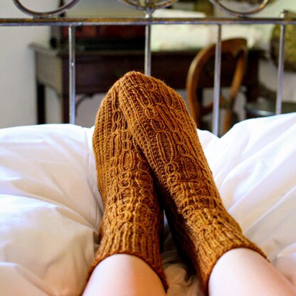 The Télégramme Socks are the coziest socks for the cooler months, including delicate cables and squishy broken rib that perfectly pairs with your Télégramme cardigan! Designed in hearty Mondim , dyed by La Bien Aimée , they are the perfect socks for lounging around the cabin by the fire, or tucking into boots for a walk in the forest. The socks are knit from the cuff down and include a special version of the New Depths Heel - my short-row heel design with an adjustable gusset for a perfect fit - to keep the broken rib pattern consistent across the heel - giving them an extra cozy look!