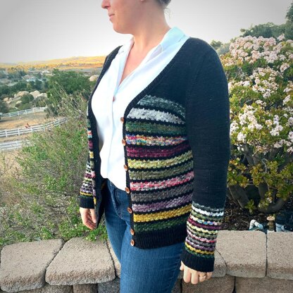 Temime Cardigan is a classic-fit cardigan featuring a buttery-soft texture, rounded V-neck, set-in sleeves, and multi-colored stripes that let you embrace your creativity while showcasing your mini skeins and scraps!