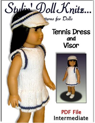 Pdf doll knitting pattern, fits 18 inch and American Girl dolls. Tennis Dress and Visor.