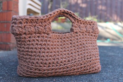 This useful bag is designed as a small handbag, big enough for a wallet, keys and phone, but has also proved useful carrying around a shawl project I’ve had on the go. Made from ribbon tape, a recycled textile product, it makes for a quick project!