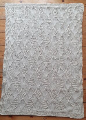 A downloadable PDF knitting pattern for a gender neutral, baby blanket. An all over textured diamond pattern with a garter stitch border, the blanket is knitted in a single colour. Required skills: Cast on, bind off, ability to work knit and purl stitches. Instructions for the diamond pattern section are given in written and graph format, giving you the option to work either way.