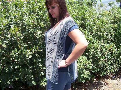 This unique and versatile vest can be adjusted to fit most body types just by relocating the removable buttons. Looks great with your favorite jeans, leggings or dress. One size fits most without any adjustments to the pattern, chest measurements ranging from 32”-52”. Used three skeins of Mykonos Light Grey, three skeins of Mykonos Dark Blue/Grey. You will need 6 buttons: three sets of 2 buttons attached together, for closing both sides and front of vest. The removable buttons allows you to adjust them to get the fit and look you want. Additional buttons can also be added for a more tailored look.