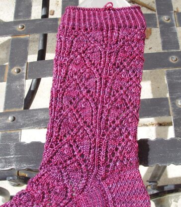 This is a toe up lace sock in 2 sizes. Small is a 60 stitch leg, Medium is a 64 stitch leg. There is an option to do the toe in an eye of partridge stitch.