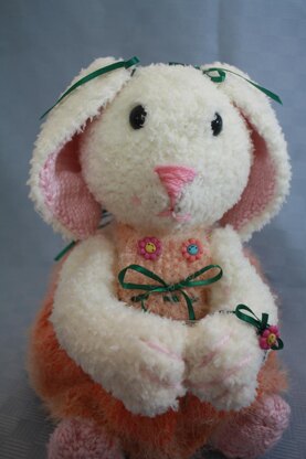 is knit in Hobby Lobby Cloud 9 and Loops and Threads Woolike yarn held together. A substitute for this is Bernat Pipsqueak as it is soft and cuddoy. The dress is done in Carons Latte Cakes yarn and the inner ears are done in Bernat Satin