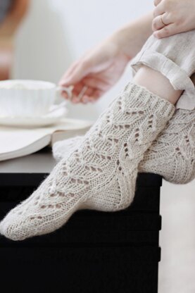 "Beautiful, romantic lacy details cascade harmoniously all over, making The Alpine Socks a truly gorgeous project to knit! Combining beautiful knit stitches and a classic structure and design, these socks work up fast due to the worsted-weight yarn used."