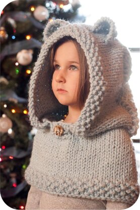 Add the bear ears for some fun or knit without for a more serious hood. Wear the cowl portion up and around your neck or fit over your shoulders for a little upper arm warmth!