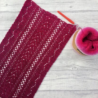 Crochet openwork uses chain spaces to create an open lacy fabric, perfect for beautifully draping scarves. This scarf is compiled of a series of geometric openwork motifs, inspired by the “Brodgar Stone”, a ~5000 year old carved stone found on the Ness of Brodgar on Orkney (Scotland) in 1925.
