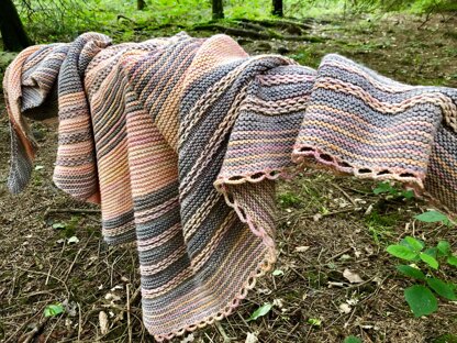 This is a large and cosy shawl, knitted using two colours of a worsted weight yarn. It features lots of squishy garter stitch, stripes and a pretty chained stitch. It's finished off with a crochet loop edging.