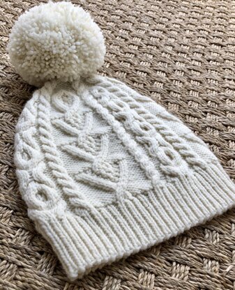 The Durrow Cap is a tour of traditional Irish gansey motifs and leaves no area of fabric uncabled. Worked bottom-up in the round, the hat is cast on using a tubular cast on for an invisible edge. The cable motif is repeated 3 times around and the crown is finished with a pom pom for the ultimate wintery appeal.