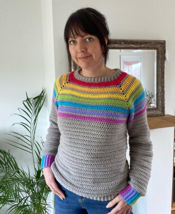A raglan style sweater in half double crochet (hdc) that is suitable for confident beginners. The pattern has lots of notes and pictures to help beginners try out this style of sweater. I have included instructions to help with the colour changing.