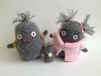 Say hello to the Fluff Family! Dusty and Floss and dustmite Fuzz. Amigurumi creatures with knitted 'dustbag' and 'dustjacket'. Dusty was originally made from the dust and fluff that gathers around the house...you know the stuff...the balls of fluff that you find under cupboards and beds where its quiet. He came into my life with his cute smiley face and made me smile too. You can see more about the life and times of Dusty and Floss here: http://www.flickr.com/photos/polly-jane/8675405194/in/set-72157625594744063/
