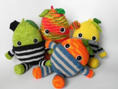 Meet the gang! There’s Tony Tangerine, Leroy Lime, Lester Lemon and Organic Oscar. These quirky little fruits are a group of fun love’n fellas who are happiest hanging out in your kitchen, office or playroom. So quick to knit up, you’ll have a bowl full before ya’know it. Do you love stripes, stuffies & silliness? Are you working through your stash? Me too! These lil’fella’s were so much fun to design and knit and are a great project for stash busting. Suitable for all yarn weights and perfect for using super fun variegated yarns and/or your odds-n-ends leftovers. You can knit them with or without clothes…like Oscar. He’s our free spirited Froot Loop. Oscar loves nature so he’s all about organic & easy breezy living. No clothes for this little dude - he prefers to be nekkid! Clothed or au naturale, these adorable little citrus are just as sweet as can be. S