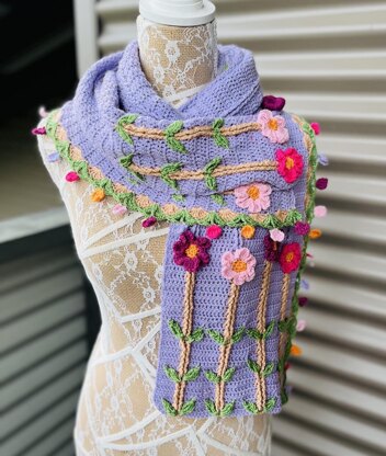 The main body of the scarf uses simple stitches, making it a relaxing and enjoyable project. Long-stemmed flower heads are sewn in place, while leaves are crocheted around the post stitches that form the stems. Smaller flowers bloom along one edge of the scarf for added charm. A yarn-made button is used to fasten the scarf neatly at the neck. This design is intended to wrap around the neck twice before buttoning.