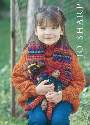 This collection of children's sweaters, scarves and dollies is worked in Jo Sharp Classic DK Wool. The sweater is a simple drop shoulder shape and is worked in knit & purl textures from a graph with some light cable work.