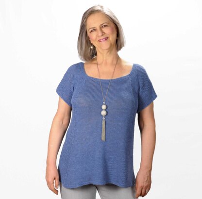 This summer top is created with simple stocking stitch and garter stitch, worked in two different directions. It uses a classic, sport weight, 100% linen yarn. The side body and sleeves are picked up on a circular needle and knitted out from centre body segments. The sample is knit in a slightly looser gauge to encourage extra drape in the fabric. It is shown with no ease at the bust. The hip has 28 cm (11 inches) of ease, making it flatter a variety of figure shapes. The sample is size +94 cm (37 inches) and is shown on a 94 cm (37 inch) mannequin and model. There is very little finishing required on the garment as all outside edges are worked in garter stitch and only the underarm is seamed. Sides are joined with three needle bind off.