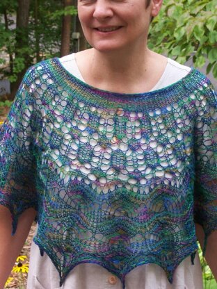 Shown knit with two 50g skeins of Regia 4-Fach yarn (Kaffe Fassett colorway), this shawl reflects the beauty and the movement of the Irish Sea.