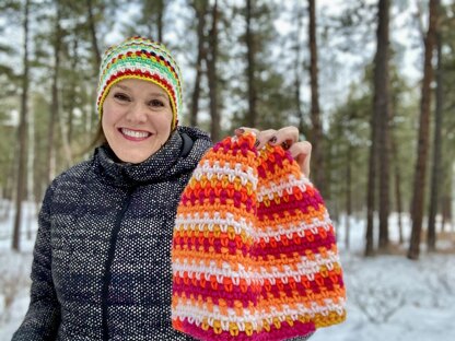 An easy beginner moss stitch hat to use leftovers of Red Heart Granny Square All In One yarn! YouTube video tutorial on the Pretty Peaceful Crochet channel.