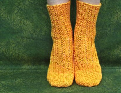 This mirror imaged sock pattern was born late one summer solstice evening (hence the name) when I had an urgent need to knit some new socks that would work well in both warmer and cooler temperatures. Living at a higher elevation can mean some cool summer mornings and evenings while the day remains quite warm. With these fluctuations in temperatures in mind, and those cool on the ankle air conditioning induced breezes, I looked to design a pair of socks that could be worn comfortably all day and this combination of a lace column combined with knit and purl ribbing fit the bill nicely.