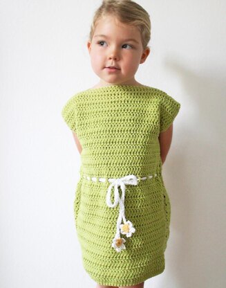 The Nixie Sun Dress has a simple, modern silhouette, including a boat neckline, tunic style hem and split cap sleeves. It also has an adorable little drawstring with daisies on the ends! This dress is super easy to work up, using inly basic stitches and simple assembly steps.