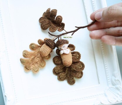 This pattern consists of the oak branch with oak leaves and acorns, and a removable sleeping baby doll.
