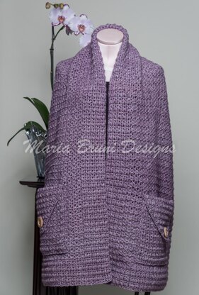 Wrap yourself in this beautifully textured, warm, and cozy pocket shawl. The Modified Puff Stitch used on this shawl is a fun stitch that creates a very thick and squishy fabric. The stitch is a flat Puff on the wrong side of the fabric, and a protruding Puff on the right side. It has an elegant appearance, and the border is crocheted with the Modified Puff Stitch all around. It can be customized to fit your favorite style in length and width.