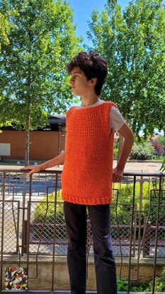 This 'poncho' is worked bottom up. It reaches up to armpit height and then splits. It is continued by working flat. Thanks to the very soft and large yarn, it can be finished very quickly.