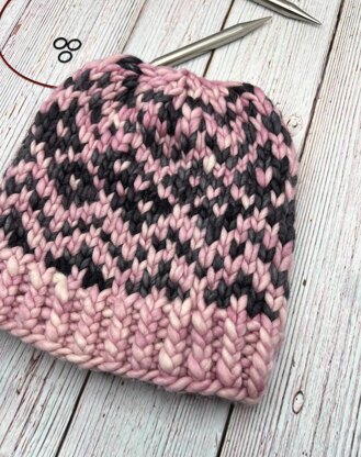 This luscious, squishy and chonky hat is just perfect for gifting or selling, and is a real showstopper paired with an enormous pom on top. It is a quick and fun project that can be done in about two hours, and is great for stash busting. The colorwork would be described as beginner, without need to catch floats, making this pattern perfect for those learning how to do fair isle knitting hats.