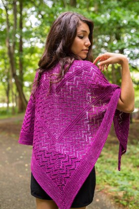 Let your spirit and needles run wild and free across the great, expansive plains of this top-down, triangular shawl. Featuring an addictive geometric lace pattern, and a twist on the garter stitch for rich textured effect. You will love how this shawl spreads its wings wide, to wrap you up.