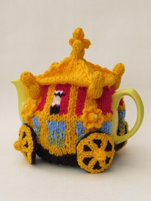 The Royal State coach is decorative with cherubs, crowns, palm trees, lions' heads, faces, tritons and glorious paintings, I had to simplify so what for a tea cosy design; so the result is an impression based on the Golden State Coach. I have included the lion heads, there's one at each corner at the mid way point up the coach. Above the lions are the finials at each corner of the roof. The roof has twisted roof decorations which echo the fauna garlands that meet up with the three cherubs. The cherubs on the tea cosy are symbolised by three bobbles representing their heads. At the very top there is interlocking rings that mirror the crowning top. Inside the red luxurious coach, you can see the Queen sitting at one window in blue and on the other side is Prince Philip.