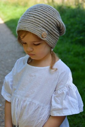 Offering style and plenty of texture, this slouchy hat has been designed with horizontal ridging and the choice of either a statement buttoned hatband or a more simple, plain hatband (both instructions included). This slouchy hat is a stylish accessory for both boys and girls, making it a perfect staple for any wardrobe.