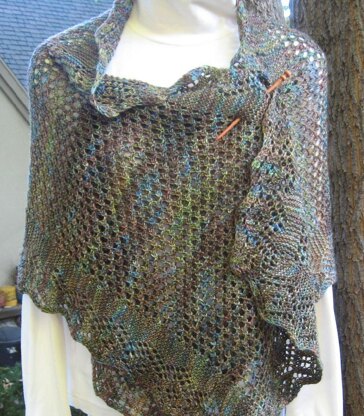 The shawl is constructed all in one piece starting with the bottom lace border, picking up stitches along that border, knitting the center of the shawl along with the borders at the same time, and ending with knitting the top border together with the center stitches.