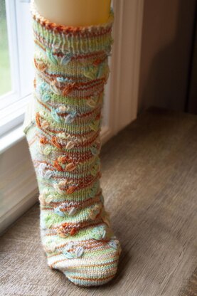 The socks were inspired by an Into the Whirled club yarn. The bright colors just wanted to be spring flowers. The Rosebud design is meant to create cascading flowers up the foot and legs.