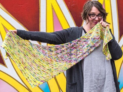 Pure, unadulterated, neon-tinted pleasure. That’s what this shawl gave me, soup to nuts. From deciding to put these two colors together to the rhythm of the Tweedy Sections to the leafy lace sections to the brick-y border, I smiled my way through this piece, and once it was done, found myself sighing and saying, “That’s the ticket…”