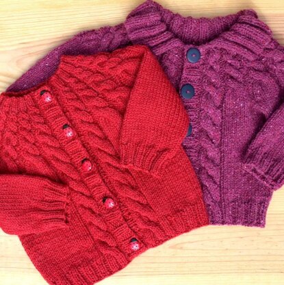 The Twist cardigan is a baby / toddler / young child’s sweater that's knitted top-down. There are 8 sizes: 3 months to 8/9 years. The pattern is suitable for those with cable skills, the pattern has written instructions. There is a collar and collarless version.