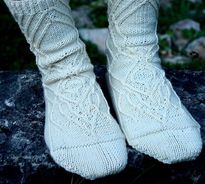 Inspired by the often subtly uncanny features of ghosts, these socks feature lovely twisted cables that cross and dance over the top of the foot and leg. They trace all the way up to the cuff, where they integrate with the twisted ribbing which finishes off the pattern.