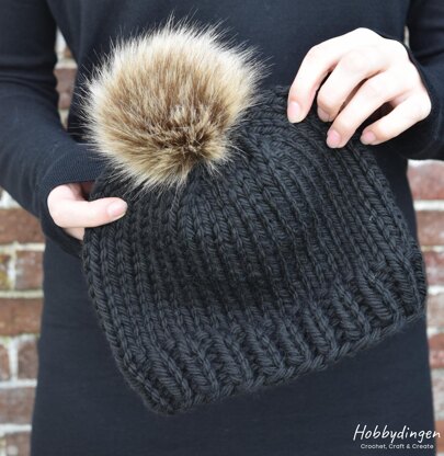 The Wonderland Hat, a beautiful, quick to knit hat made with Super Bulky weight yarn. Perfect for gift knitting! This hat has ribbing on the bottom and a pompom on top.