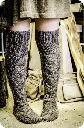 The Woodcutter’s Daughter is knit in the round, from the toe up. It’s a Tube Sock so there is no heel to turn, no gussets to make. The pretty Cable pattern that runs up the center of the socks creates a natural “shaping" to the sock. The cable twists occur at the ankle to help shape the foot and then the proceeding cable twists help further shape the calf. These would also be adorable with suede or felt soles sewn to the bottoms.