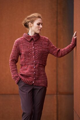 Notions: 11 buttons (18 mm/28L, 11/16”), stitch markers (removable), cable needle and yarn needle.