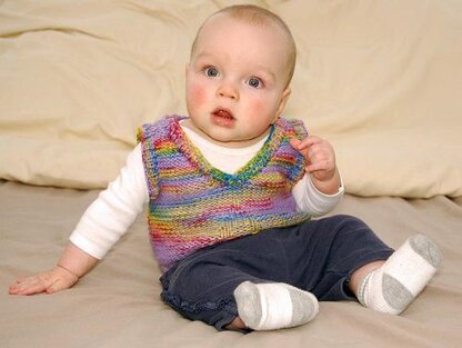 Baby knits present a great mini-project for the new and experienced knitter, with wonderfully cute results. “This End Up” is a relatively straightforward baby vest with some textured detail at the front and back waistline for extra interest. It looks like an arrow, helpfully indicating which end of the baby should be upright—every little bit helps when you’re a new parent!