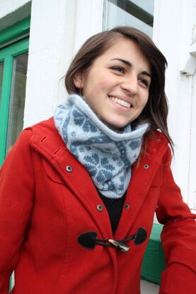 The cowl uses a stitch pattern based on Chippendale trellis with Norwegian style motifs. The use of travelling colourwork as a design feature independent of shaping needs was inspired by the wonderful work of fellow designer, Kieran Foley.