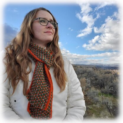 The pattern uses No. 9 US Straight Knitting Needles and the yarn used in the pattern photo is 1 Big Twist Value Burnt Orange 4 Worsted, 1 Big Twist Value Varsity Green 4 Worsted, and 1 Big Twist Value Soft Grey 4 Worsted.