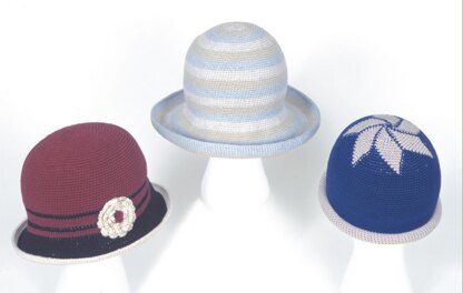 Very easy-to-make: single crochet stitch used throughout. Wide brimmed sun hat, hat for all seasons with medium brim and flower, winter hat with six-pointed star and roll brim.