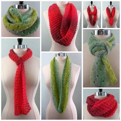 There are three patterns from which to choose. Pattern One is a big and fluffy cowl which is knitted flat and then seamed. It can be worn long or looped twice. Pattern Two is for a slender scarf which is knitted flat and then the ends can be sewn together or not as you choose. It can be worn a variety of ways. Pattern Three is for an infinity scarf/cowl with staggered eyelets knitted in the round. It can be worn long, looped twice or tied with a big knot.