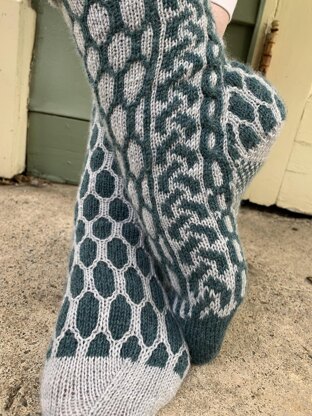 The socks are worked cuff down starting with a double rolled cuff. After completing the gusset, the colorwork cables become faux cables on the foot. Charts are included to mirror the cables if desired.