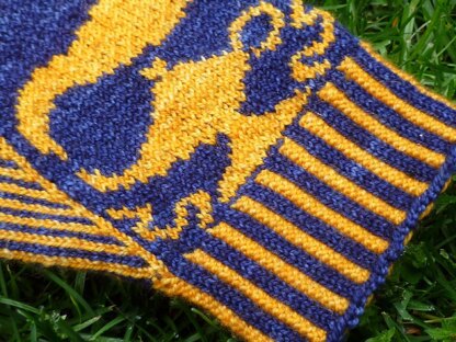 To knit this pattern, you will need fingering weight yarn in two contrasting colors -- approximately 150 yds./137 m of the main color and approximately 135 yds./123 m of the contrast color. (Note that two skeins of the recommended yarn will be more than enough to knit two pairs of mittens!) You'll also need three stitch markers, a yarn needle (to weave in ends), and a length of waste yarn (to hold your thumb stitches). To knit this pattern, you need to know how to knit and purl in the round using two colors, read and work from a colorwork chart, do directional increases (m1L and m1R), and graft using kitchener stitch. Final dimensions: Cuff circumference: 7.5 in./19 cm Length: 8.75 in./22.25 cm.
