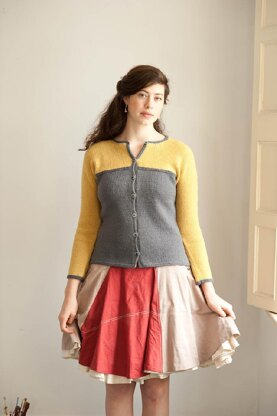 This design uses colour and stitch definition to stand out from the crowd. Each colour is worked in a different direction and framed with a neat garter stitch trim. The design features visible decreases along the sleeves with the cardigan fronts shaped with short rows.