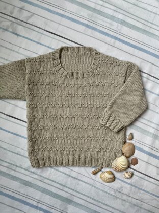 Tidelines is an easy wear double knit children’s sweater featuring a textured front, double ribbing and stocking stitch back and sleeves. Each piece is worked flat from the bottom up, with stitches picked up to form the neckband.