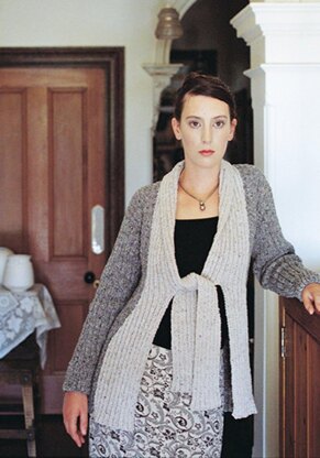 The bodice of this snug fitting ribbed jacket is worked in a single piece from back to front. The contrasting tie collar is knitted separately. Suitable for an intermediate knitter.