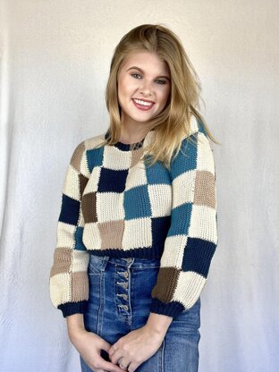 This is a Tunisian crochet mock-knit sweater with join-as-you-go patchwork squares. This pattern is great for an advanced crocheter wanting to dive into a more difficult Tunisian crochet pattern. This is also a Mae to Measure pattern.